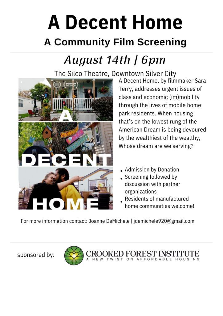 Join us at The Silco Theatre on Wednesday, August 14th at 6pm for this screening of “A Decent Home,” about the social cohesion as well as radical economic vulnerability of homeowners who live in manufactured housing communities. They own their homes, but not the land underneath them and many of them didn’t see it coming when these communities found themselves getting snapped up by private equity investors.