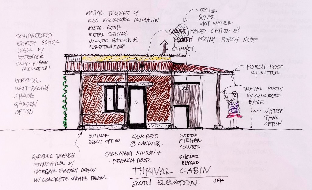 In order to provide dignity, safety, and housing for the maximum number of people within the limits of what each ecosystem can support, Crooked Forest’s home designs are small and simple. Their pilot project is a ten-home neighborhood on shared infrastructure. The homes are only 400 square feet each, but have their own kitchens, and bathrooms. By creating homes that are the size of the largest RVs, Crooked Forest envisions securing a specialized ordinance (as has happened in two other New Mexico counties), allowing for permanent structures to be built on RV park infrastructure. The 400 square foot adobe homes would be built on each RV site (with no RVs), while the whole neighborhood would be located on a Community Land Trust, so that each of the small homes would be buyable.